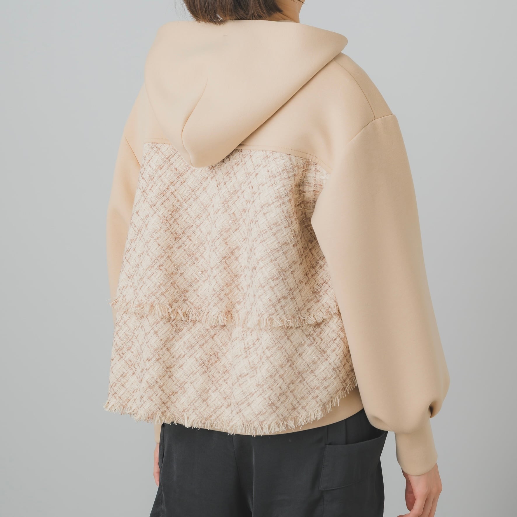 ツィードとベースの素材を絶妙に組み合わせたこのパーカーは、カジュアルながらも上品な印象を与え、普段のコーディネートに特別感を添えます。