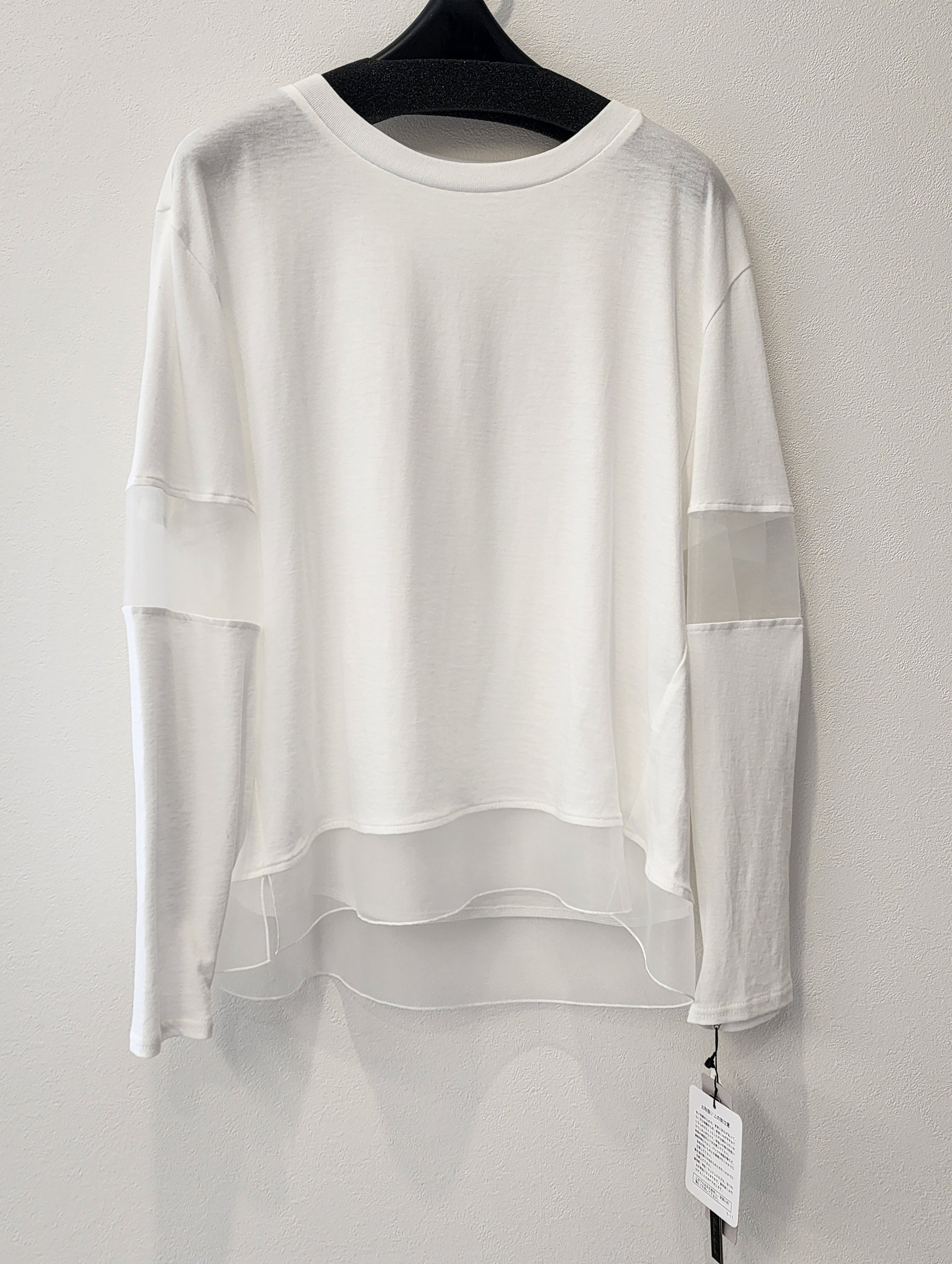 シアー素材の切り替えがトレンド感を演出し、軽やかでありながらもスタイリッシュな印象を与えます。ロング丈は着こなしの幅を広げ、重ね着にも最適です!心地よい素材感はデイリーコーディネートにもぴったりのアイテムです!